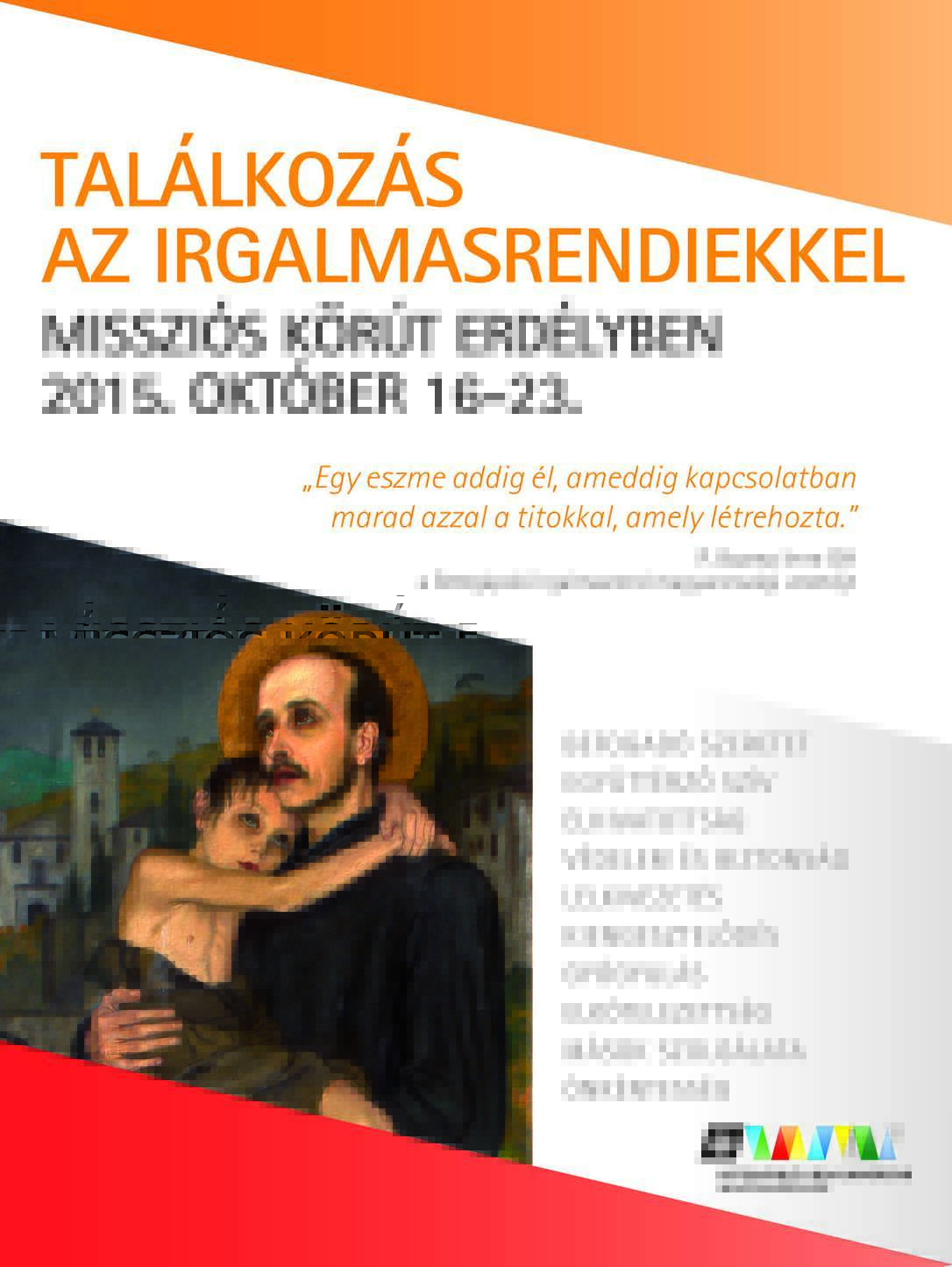 2015 október 16. és 23. között a Magyarországi Betegápoló Irgalmasrend missziós körutat szervezett Erdélyben. Célunk az volt, hogy a hospitalitásra épülő gyógyító kultúrát minél jobban elmélyítsük az érdeklődőkben.