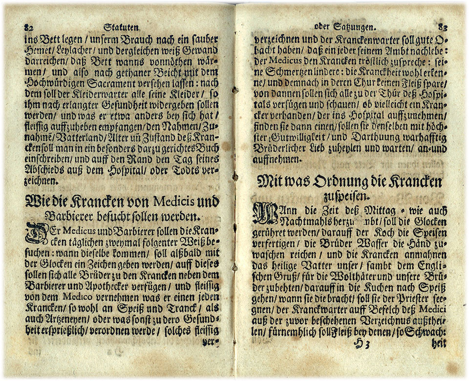 Der Medicus und Barbierer sollen die Krancken täglichen zweymal folgenter Weis besuchen: wann dieselbe kommen / soll alsbald mit der Glocken ein Zeichen geben werden / auff dieses sollen sich alle Brüder zu den Kranken neben dem Barbierer und Apotheker verfügen / und fleissig von dem Medico vernehmen was er einen jeden Krancken / so wohl an Speis und Tranck / als auch Arzneyen / oder was sonst zu dero Gesundheit ersprießlich / verordnen werde / solches fleissig verzeichnen und der Krankenwarter soll gute Obacht haben/ daß ein jeder seinem Ambt nachlebe, der Medicus den Kranken tröstlich zuspreche, seine Schmerzen lindere, die Kranckheit wohl erkenne / und demnach in deren Chur keinen Fleiß spare / von dannen sollen sich alle zu der Thür des Hospitals verfügen und schauen / ob vielleicht ein Krancker verhanden / der ins Hospital auffzunehmen / finden sie dann einen / sollen sie denselben mit hochster Gutwilligkeit / und Darthuung wahrhaftig Brüderlicher Lieb zuheylen und warten / an- und auffnehmen.